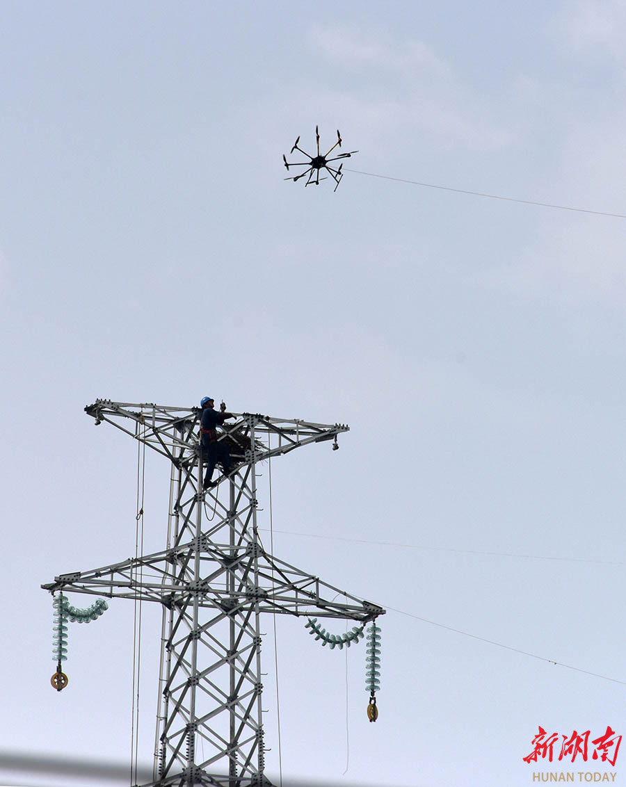 4月3日,澧县大堰垱镇宋家台村,工作人员在运用无人机飞架高压线牵引绳。澧县芦家-楠竹110kV线路提质改造工程现在已进入高压线架起阶段,工作人员运用无人机“牵线搭桥”,进步施工功率,缩短施工时刻,节省施行工程的本钱。 柏依朴 摄(湖南图片库)